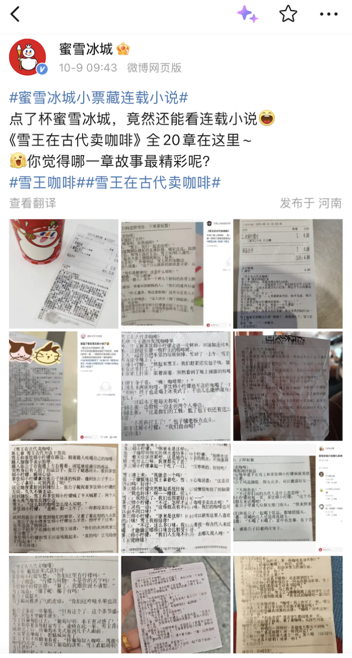 蜜雪冰城玩得更嗨。他们把《雪王在古代卖咖啡》拆成20个章节,随机印在千万张小票上。为了凑齐完整剧情,素不相识的年轻人在社交媒体上自发组建“换章互助站”,彼此交换手里重复的篇章。