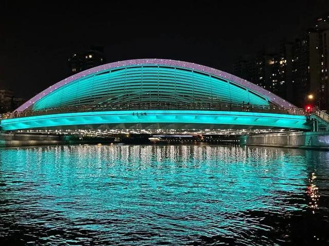 2020年12月6日,西南方向断头昌平路架桥过河,直通东北方向恒通路,泰兴路连接上西苏州路,右拐上昌平路桥,蝴蝶湾气脉直达北部腹地。昌平路桥为钢拱桥,跨径59.86米,主体结构纯白色,桥下没有桥墩,仅靠钢索牵引固定,行人紧贴外弧形专用通道,与过往车辆完全分离,安全无虞,又能尽情欣赏沿江景致。昌平路桥被设计成两把竖琴状,如凌波仙女轻盈灵动。入夜时分,景观灯光大放异彩,恰似两只忽闪忽闪的大眼睛,被市民们亲切地称为“苏河之眼”。